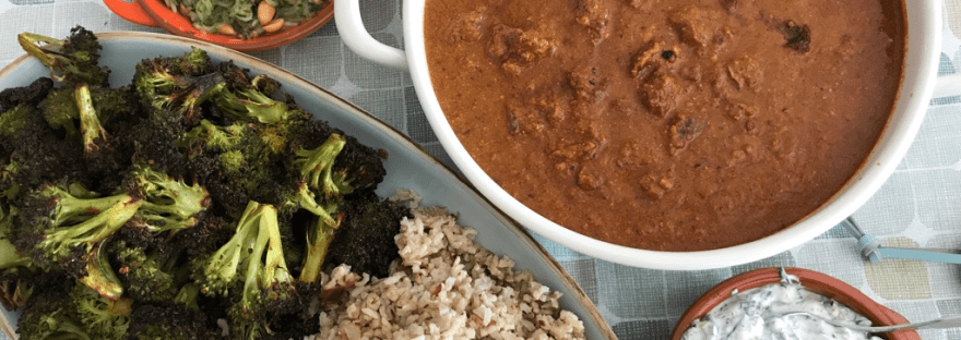 Indisches Rehgulasch mit geröstetem Brokkoli, Gewürzreis und Gewürz-Gurkensalat