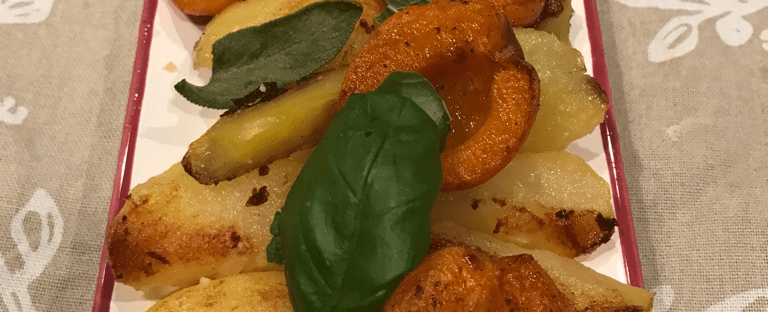 Die Kartoffeln auf einer Platte anrichten, die Aprikosen darauf verteilen und mit den Salbeiblättern aus der Pfanne und etwas frischem Basilikum garnieren.
