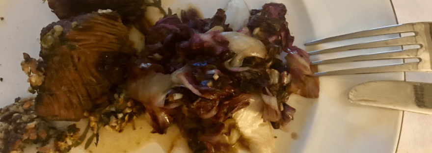 Für den gebratenen Radicchio die Radicchioköpfe in feine Streifen schneiden. Zwiebel ebenfalls in ganz feine Streifen schneiden, in Öl hellbraun andünsten. Wenn die Zwiebel leicht karamellisiert ist, die Radicchiostreifen dazugeben und 3-4 Min. in der Pfanne durchschwenken. Mit Salz und Pfeffer würzen und dann mit einem ordentlichen Schuß Balsamico ablöschen. Sofort aus der Pfanne nehmen und mit dem Braten servieren.