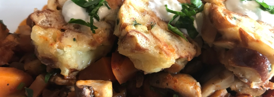 Brezenknödel mit Emmentaler und Pilzgulasch
