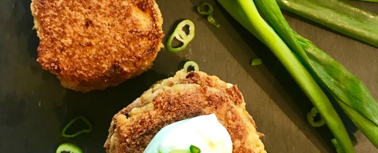 Die Pflanzerl mit einem Klecks Saurem Rahm und den Frühlingszwiebelröllchen servieren. Dazu passt eine schöne Schüssel gemischter Salat.