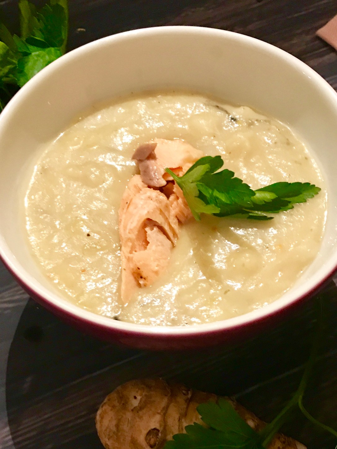 Heute gibt es eine Suppe aus Topinambur und Wurzelgemüse. Der Lachs, der im Ofen gegart wurde, eignet sich bestens als Einlage. Aber auch Speck, Selchfleisch, Kassler oder knusprige Croutons schmecken sehr lecker dazu. Oder ein Topping aus gerösteten Walnüssen und Thymian!