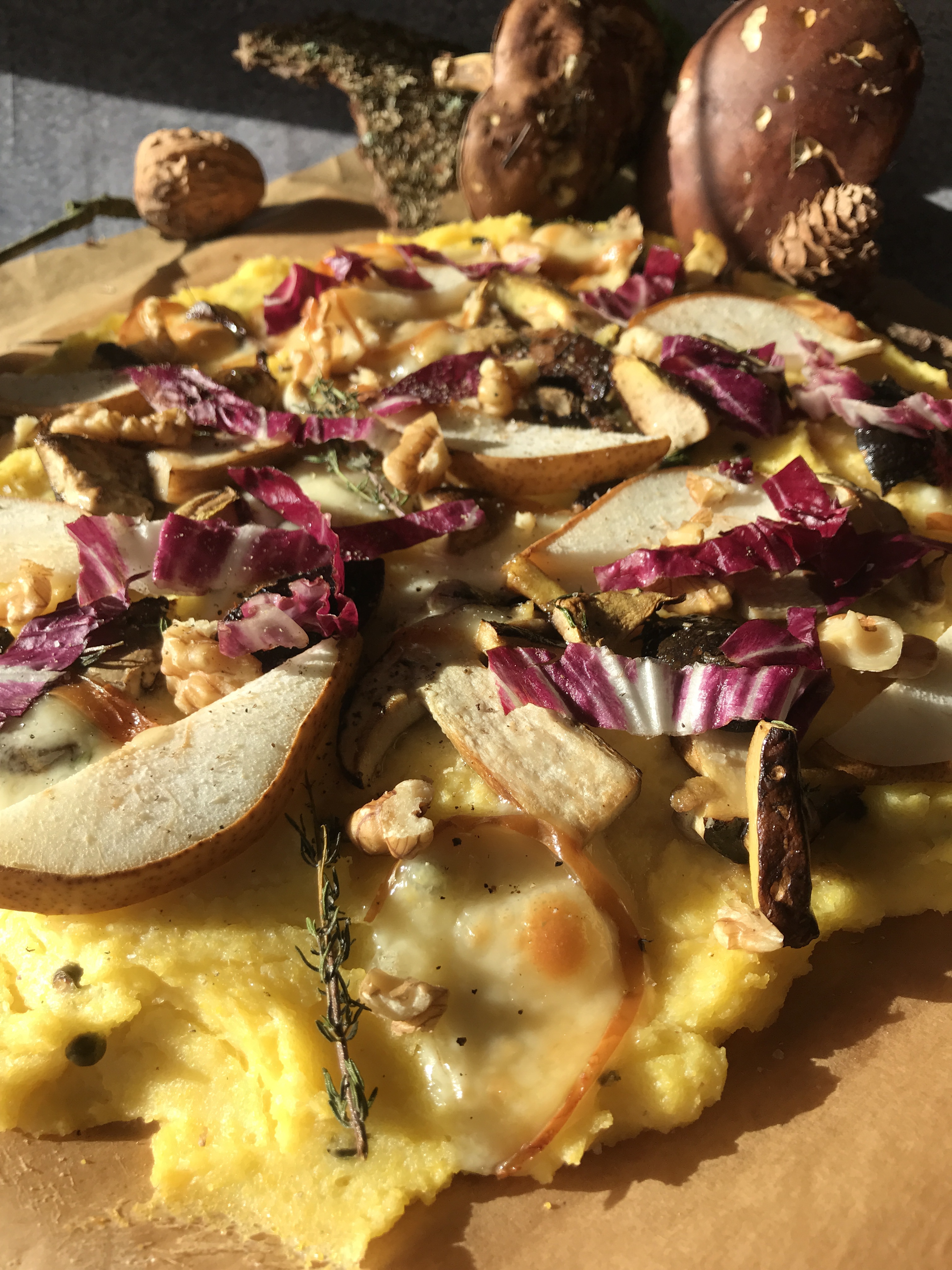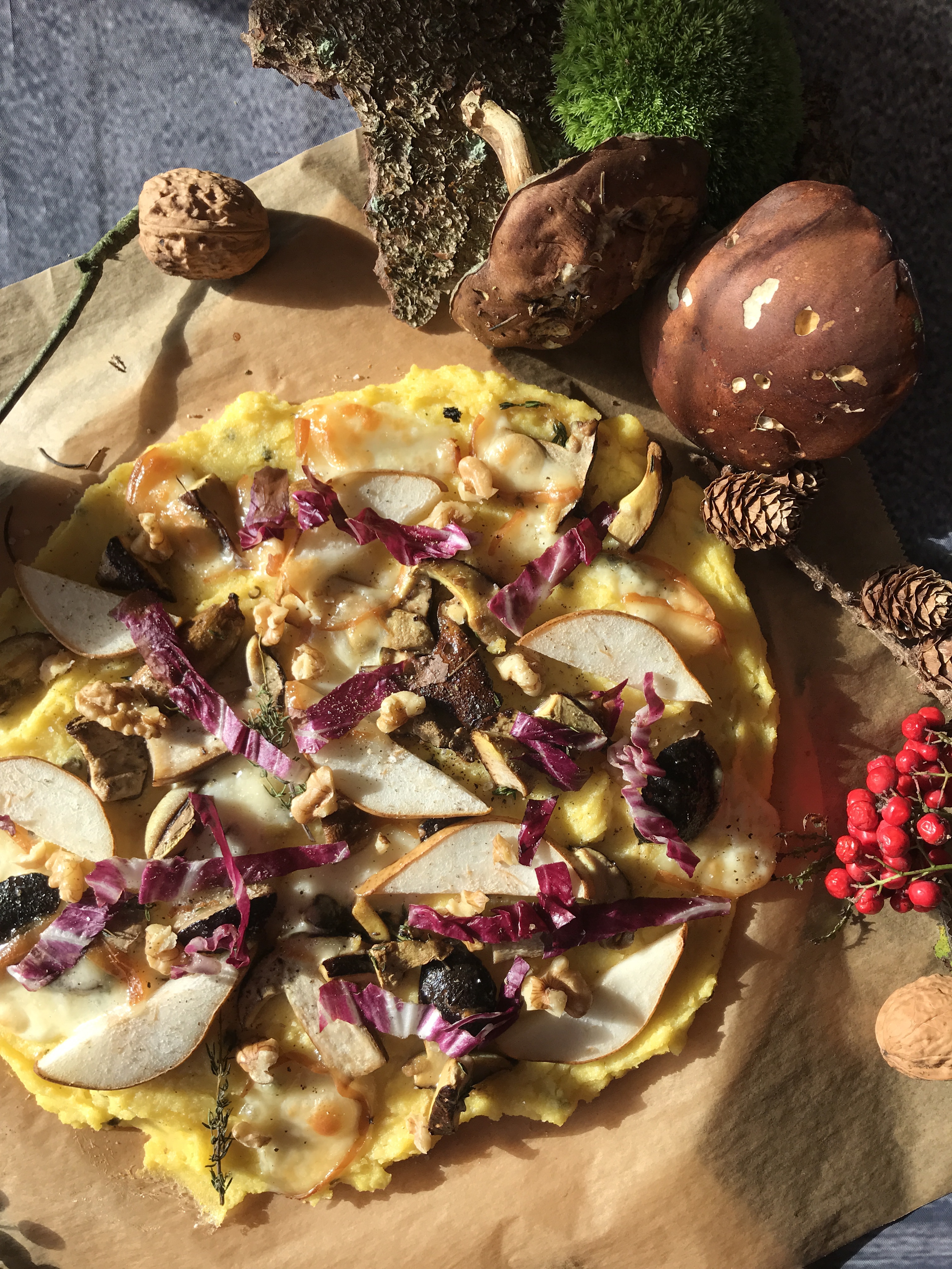 Die Pilze in Scheiben schneiden und in einer heißen Pfanne in etwas Öl zusammen mit den Thymianzweigen kurz, aber kräftig anbraten. Die Birne schälen, entkernen und in 1cm dicke Scheiben schneiden. Den Scamorza fein würfeln. Pilze, Birne und Scarmorza gleichmäßig auf der Polenta verteilen und ab damit in den Backofen. Die Polenta-Pizza ca. 25 Min. backen.