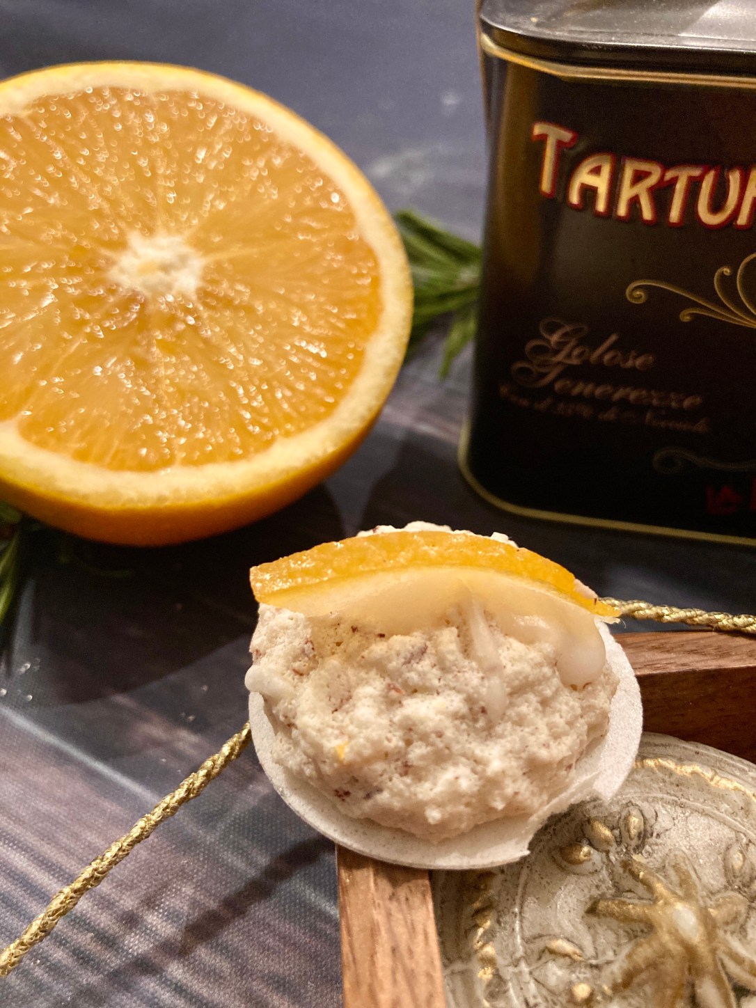 Kandierte Orangen sind eigentlich nichts anderes als Orangeat. Ich kenne keinen, dem das Zeug aus dem Supermarkt schmeckt. Deshalb kaufe ich es immer im türkischen Lebensmittelladen, da gibt es richtige kandierte Orangenhälften. Ein Duft ist das – unglaublich.