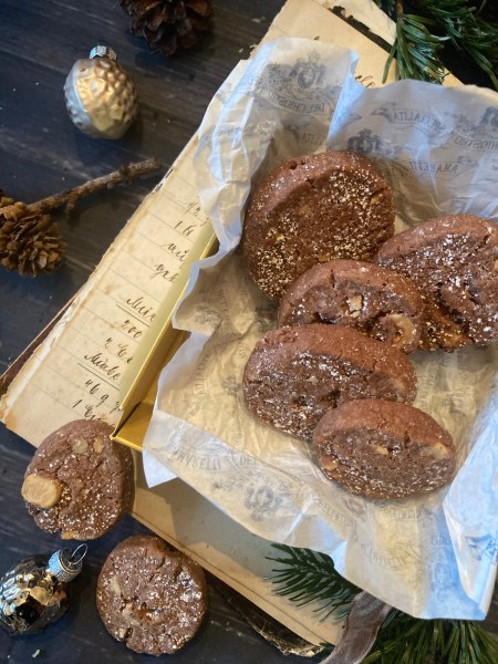 Aus dem bröseligen Teig zwei Rollen mit ca. 2cm Durchmesser formen, diese fest in Folie einwickeln und kalt stellen – gerne über Nacht, aber mindestens 2 Stunden. Dann mit einem Messer mit Wellenschliff (das geht besser als ein normales Messer, wegen der Nüsse…) vorsichtig ca. 5mm dicke Scheiben abschneiden. Die Scheiben – man muss sie eventuell noch mit den Händen ein bisschen in Form drücken – auf mit Backpapier belegte Backbleche legen, nochmal 30 Minuten kalt stellen (damit sie ihre Form behalten) und dann im vorgeheizten Backofen bei 180 Grad (Umluft) ca. 15 Minuten backen.