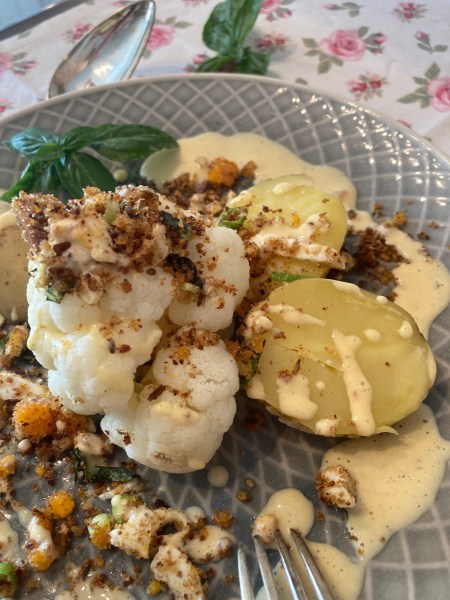 Das Gericht, das ich Euch heute vorstelle, entstand so nach und nach. Erst gab es Kartoffeln und Blumenkohl mit Butterbröseln. Dann kam ein gehacktes Ei hinzu. Dann Frühlingszwiebeln für die Frische. Dann Gewürze für den besonderen Geschmack. Und dann die Tahin-Soße, weil man einfach auch gerne mal was Soßiges dazu haben möchte. Vielleicht kommen irgendwann ja noch Nüsse oder Rosinen dazu, wer weiß. Aber ich finde, diesem Rezept fehlt nun nichts mehr. Es ist für meinen Geschmack sehr ausgewogen. Und: es ist schnell fertig. In der Zeit, in der die Kartoffeln und der Blumenkohl gedämpft werden, hat man den Rest fertig.