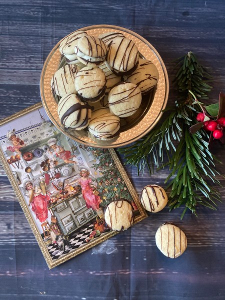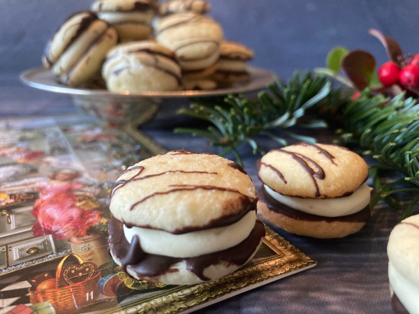 Die ausgekühlte Füllung mit den Quirlen des Handrührgeräts oder mit der Küchenmaschine schaumig aufschlagen, dann in einen Spritzbeutel mit kleiner Lochtülle füllen und auf die mit Kuvertüre bestrichene Seite von der Hälfte der Plätzchen spritzen, jeweils mit den übrigen Plätzchen zusammensetzen.