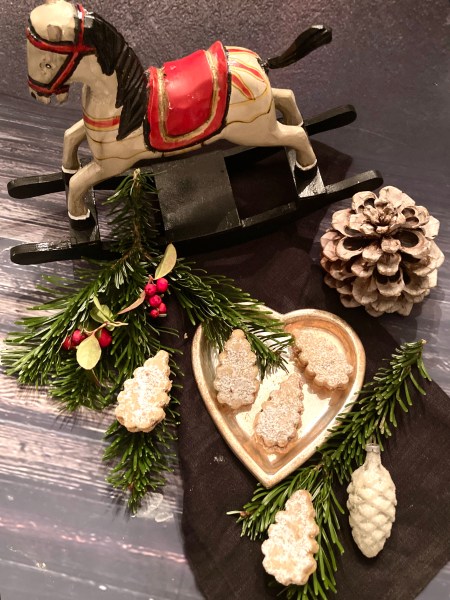 Zubereitung: Für den Teig alle Zutaten rasch zu einem glatten Teig verkneten und in Folie gewickelt 60 Min. im Kühlschrank rasten lassen. Dann auf einer leicht bemehlten Arbeitsfläche ca. 3-4mm dick ausrollen und Zapfen (oder andere Formen) ausstechen. Auf mit Backpapier ausgelegte Backbleche geben und im vorgeheizten Ofen bei 180 Grad (Umluft) ca. 10 Min. backen. Vollständig auskühlen lassen.
