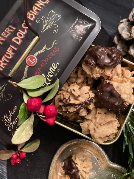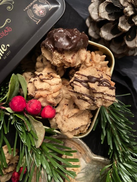 Kleine Rosetten auf zwei mit Backpapier belegte Backbleche spritzen und diese 15 Minuten kalt stellen. Dann im vorgeheizten Backofen bei 180 Grad (Umluft) ca. 12-15 Min. backen, bis sie goldbraun sind.