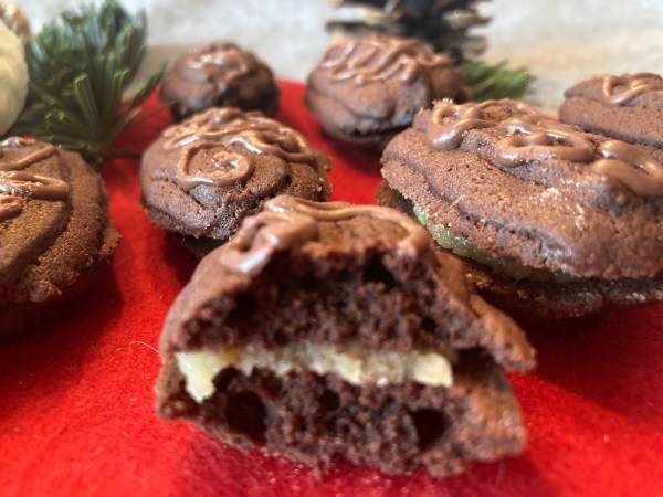 Den Teig spritzt man mit einem Spritzsack auf. Nach dem Backen wird er mit einer traumhaften Marzipan-Orangen-Masse gefüllt. Und dann sollte man die Plätzchen am Besten 1 Woche in Ruhe lassen, bevor man sie isst. Denn dann ziehen sie so richtig durch. Wenn man es überhaupt aushält, 1 ganze Woche zu warten…
