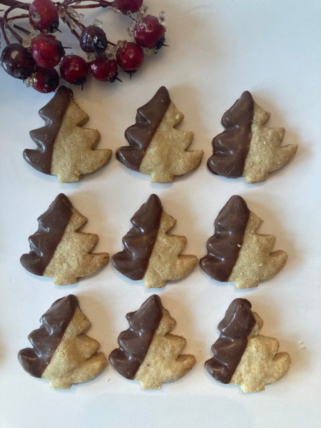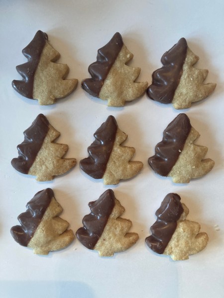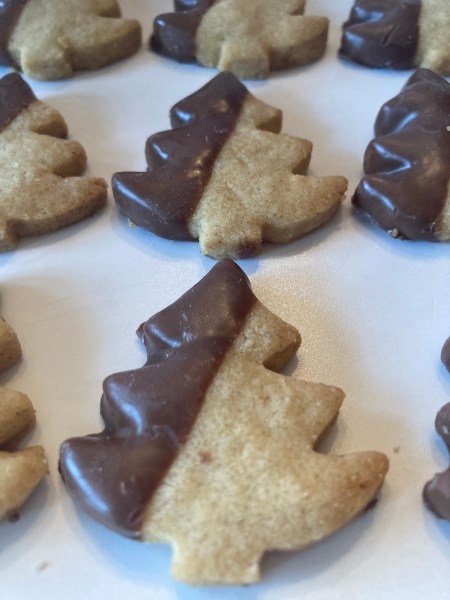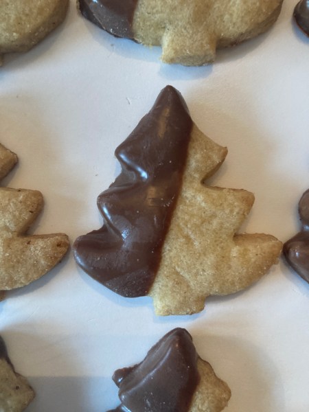 Den Teig auf einer bemehlten Arbeitsfläche ca. 4-5mm dick ausrollen, Bäumchen ausstechen und diese im vorgeheizten Backofen bei 180 Grad (Umluft) ca. 10 Min. backen.