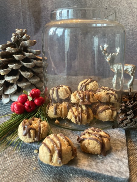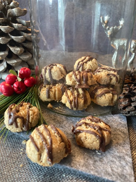 Die Cookies im vorgeheizten Ofen ca. 15-20 Min. backen und abgekühlt mit etwas Kuvertüre dekorieren.