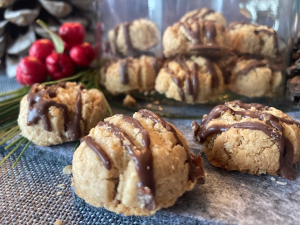 Den Backofen auf 180 Grad (Umluft) vorheizen und 2 Backbleche mit Backpapier auslegen. Mit einem Kaffeeportionierer (oder zur Not einem Teelöffel) etwas von dem bröseligen Teig abstechen und zu ca. walnußgroßen Kugeln formen. Ich habe den Teig fest in den Kaffeeportionierer gedrückt und dann auf das Backblech gesetzt. So hat man immer eine schöne Form. Mit einer Gabel kreuzweise ca. 1cm hoch platt drücken und dabei ein Muster eindrücken.