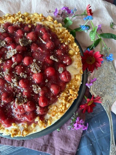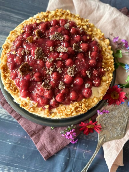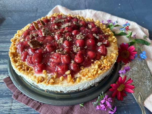 Beim ersten Versuch wollte die Gelatine nicht so wie ich wollte und die Masse ist zu weich geworden. Macht nichts – wem das passiert, der serviert die ganze Torte einfach mit einem großen Löffel, dann kann sich jeder einen großen Schlag auf den Teller geben. Oder man macht einfach ein Triffle daraus: in ein Glas gibt man unten Pumpernickelbrösel mit Zucker, dann füllt man die Käsesahne darauf und toppt alles mit den Kirschen. Perfekt!