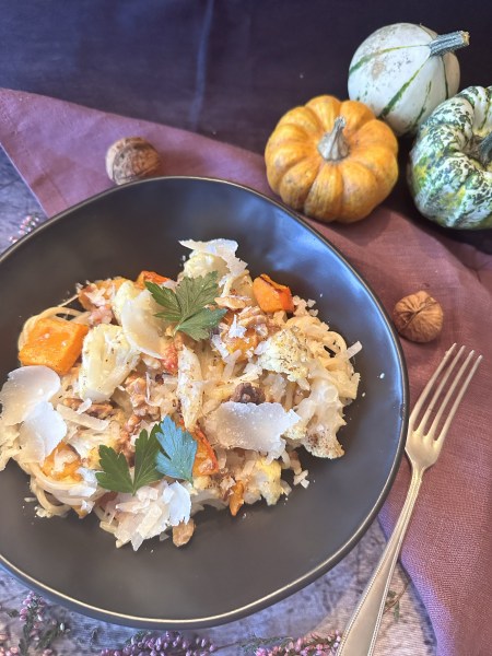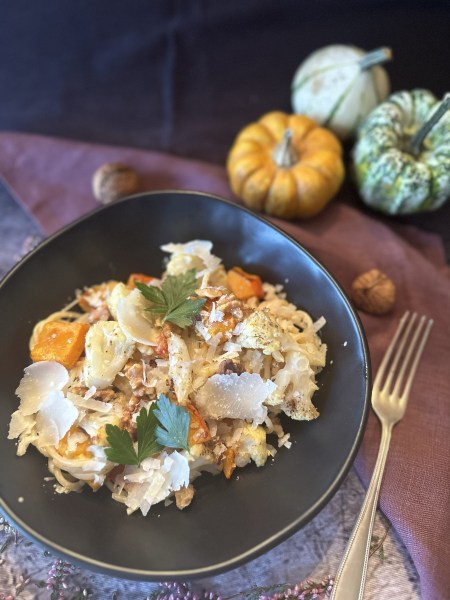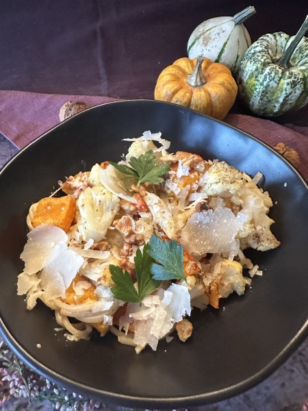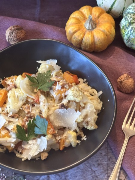 Ein schönes, köstliches Herbstgericht. Blumenkohl und Kürbis gehören zu meinem absoluten Lieblingsgemüse. Beides im Ofen geröstet – unbeschreiblich.
