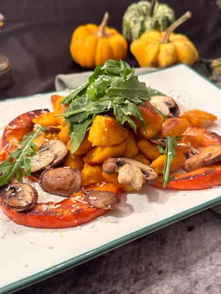 Butterschmalz in einer großen Pfanne erhitzen und die Kürbis-Paprika-Gnocchi portionsweise goldbraun anbraten. Den Rucola mit dem Dressing mischen. Gnocchi mit dem Ofengemüse auf Tellern anrichten und mit einem Häubchen Salat toppen.