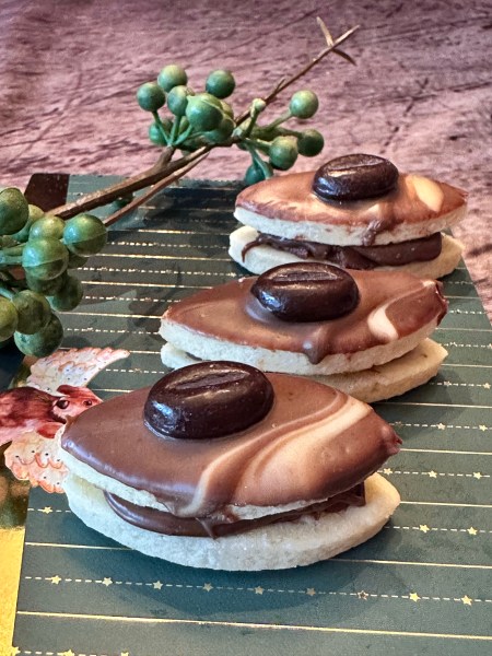 Den Nugat ebenfalls über einem Wasserbad schmelzen, das Instantkaffee-Pulver einrühren und auflösen lassen. Jeweils ein unbestrichenes und ein bestrichenes Plätzchen mit der Nugatmasse zusammensetzen und einige Stunden festwerden lassen.