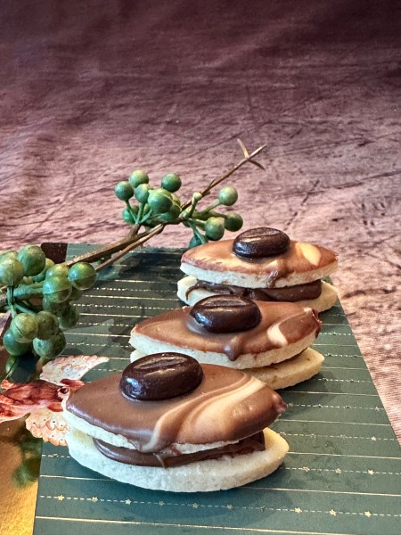 Die Mokkaschokolade fein hacken und über einem Wasserbad schmelzen lassen. Die Hälfte der Plätzchen damit bestreichen und mit einer Schoko-Mokkabohne dekorieren.