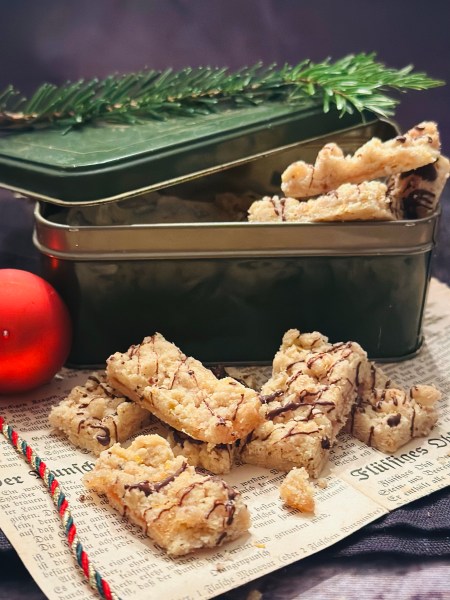 Heute gibt es Ingwer-Orangen-Stangen. Der Mürbteig wird mit frischem Ingwer verfeinert, darauf kommt aromatische Orangenmarmelade, die von Streuseln gekrönt wird. Was will man eigentlich mehr?