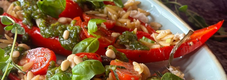 Röstpaprika mit Orzo-Nudelsalat und Zitronen-Basilikum-Pesto