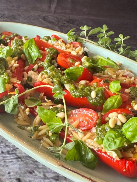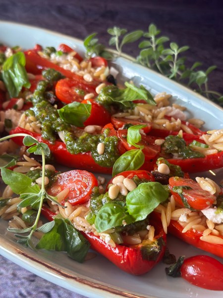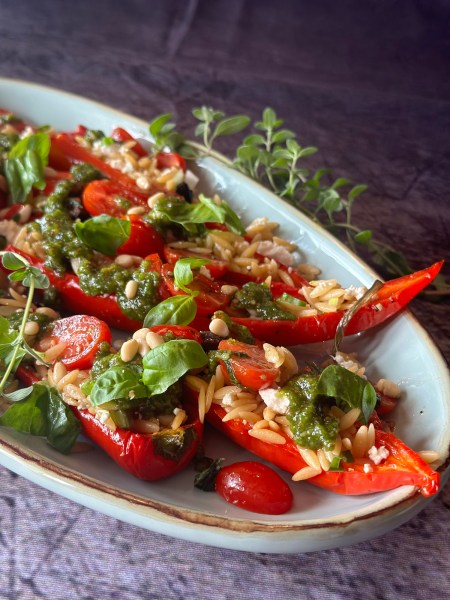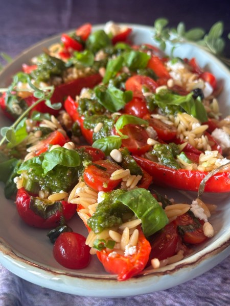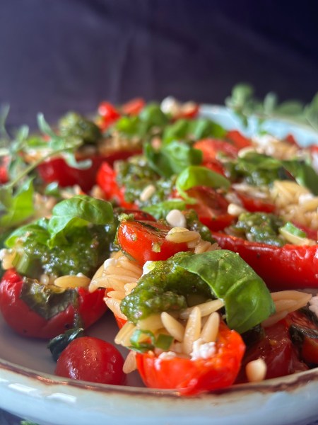 Röstpaprika mit Orzo-Nudelsalat und Zitronen-Basilikum-Pesto