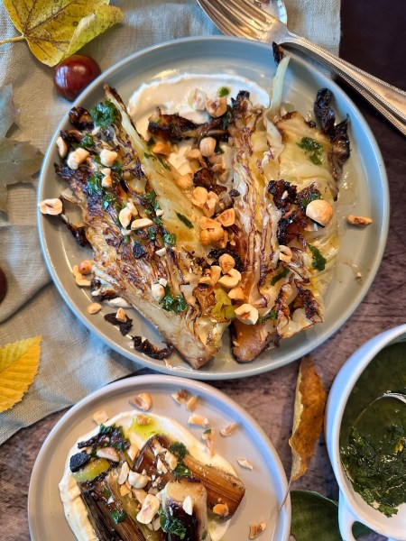 Was für ein Gedicht! Gebratenes Kraut und gebratener Lauch mit aromatischen Kräutern und herrlicher Joghurtcreme! Und dann auch noch braune Butter und geröstete Nüsse.