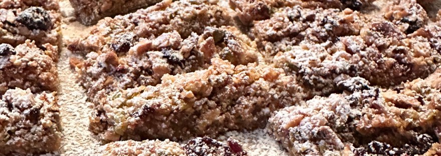 Heute gibt es Plätzchen, die nicht viel Arbeit machen. Hier werden Nüsse und Cranberries einfach mit Zucker vermischt und auf Mürbteig gegeben. Ich war mir nicht sicher, ob das alles so zusammenhält oder ob die Stangen beim Schneiden nicht einfach in ihre Bestandteile zerfallen. Denn normalerweise braucht man ja irgendwas zur Bindung der Nüsse -… Weiterlesen Nuß-Cranberry-Stangen
