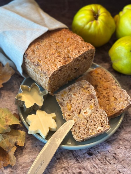 Nach 2 Stunden – oder am nächsten Tag – eine Kastenform mit Backpapier auslegen, den Backofen auf 180 Grad (Umluft) vorheizen. Die Tonkabohne mit Hilfe einer kleinen (Muskat-)Reibe zu den Quitten reiben. Mehl, Zimt, Salz und Backpulver mischen, unter die Quittenmischung arbeiten. Zum Schluß die ganzen Haselnüsse dazugeben. Alles zu einem weichen Teig kneten und in die vorbereitete Kastenform geben. Glattstreichen und im vorgeheizten Ofen ca. 50 Min. goldgelb backen. Mit etwas Butter servieren.