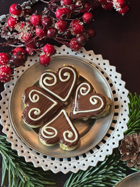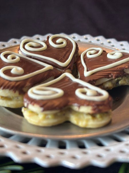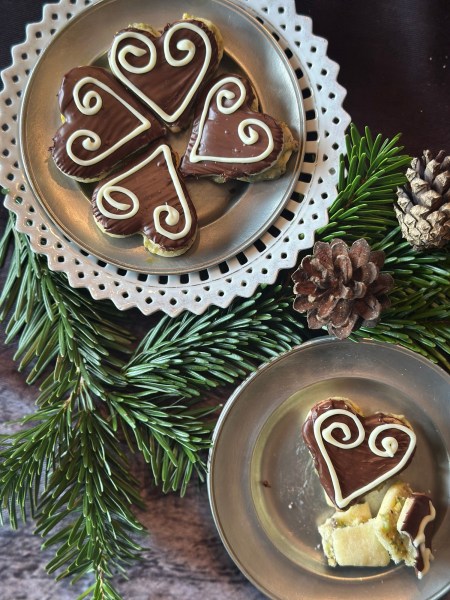 Für die Glasur die Zartbitterkuvertüre klein hacken und über einem Wasserbad schmelzen lassen. Die Schüssel aus dem Wasserbad nehmen, den Nougat dazugeben und in der warmen Kuvertüre zergehen lassen. Beides gut verrühren und die Hälfte der Herzen damit überziehen. Auf die übrigen Herzerl – also die ohne Schokoglasur – jeweils einen Klecks der Pistazienmasse geben, je mit einem Schokoherzerl zusammenkleben.