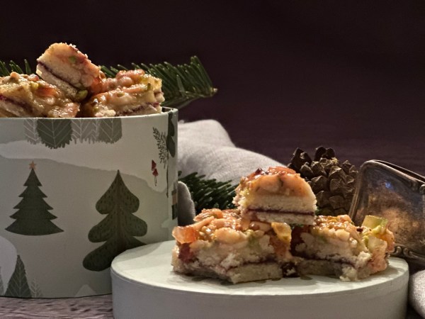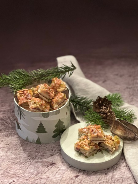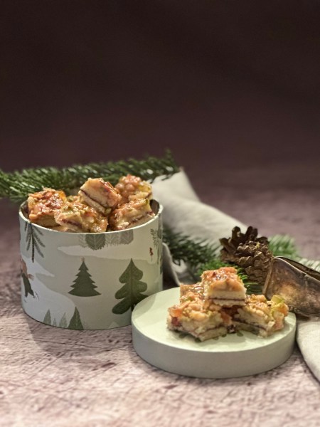 Den Backofen auf 180 Grad (Umluft) vorheizen, eine Backform ca. 23x23cm mit Backpapier auslegen. Den Teig halbieren und die erste Hälfte auf der bemehlten Arbeitsfläche in Größe der Backform 3mm dünn ausrollen und in die Form legen. Im Ofen ca. 15 Min. goldbraun backen, herausnehmen und auskühlen lassen. Mit der 2. Teighälfte ebenso verfahren, nur diese nicht aus der Form herausnehmen, sondern einfach mit der glattgerührten Marmelade bestreichen. Die zweite Teighälfte vorsichtig darauflegen – nun sind beide Teigplatten mit Marmelade zusammengesetzt und liegen aufeinander in der Backform.