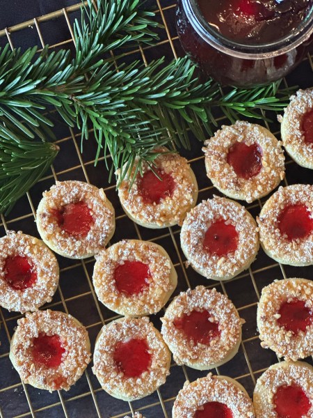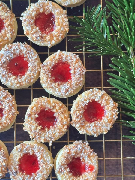 Das Johannisbeergelee in einem kleinen Topf auf dem Herd erhitzen und glatt rühren. In einen kleinen Plastikspritzbeutel geben, die Spitze abschneiden und jeweils etwas Gelee in die Mitte der Plätzchen füllen. Über Nacht festwerden lassen, dann in Blechdosen verpacken.