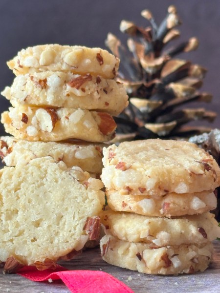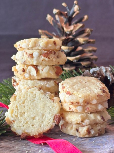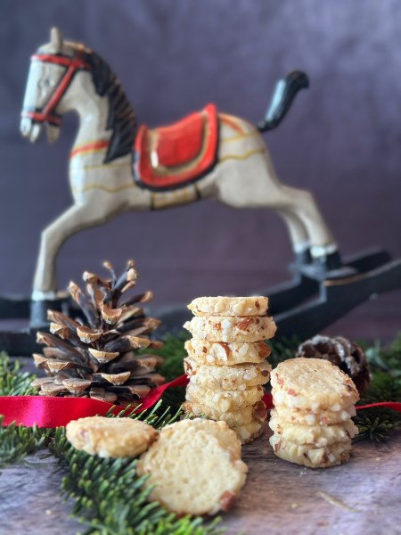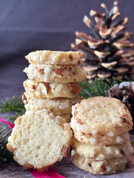 Der Teig ist ein bisschen schwierig zu verarbeiten – zumindest hat er mich geärgert. Am besten, man lässt den Teig einen Tag im Kühlschrank, bevor man ihn zu einer Rolle formt. Der Aufwand lohnt sich in jedem Fall für die sehr aromatischen, mürben Plätzchen.