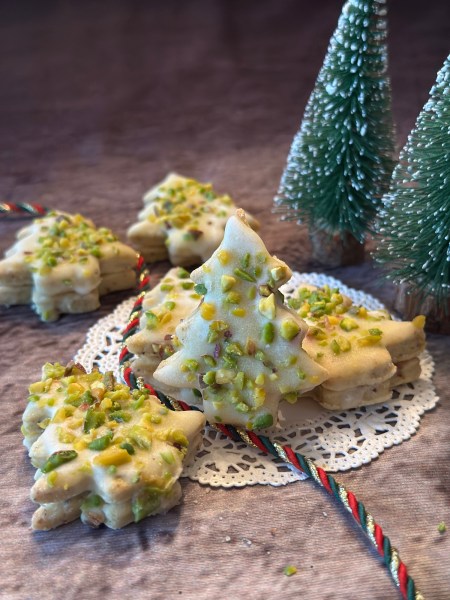 Das Lemon Curd oder die Marmelade glattrühren und jeweils zwei Bäumchen damit zusammensetzen. Für die Glasur Puderzucker und Zitronensaft zu einem dicken Guß verrühren und die Bäumchen damit überziehen. Mit gehackten Pistazien bestreuen.
