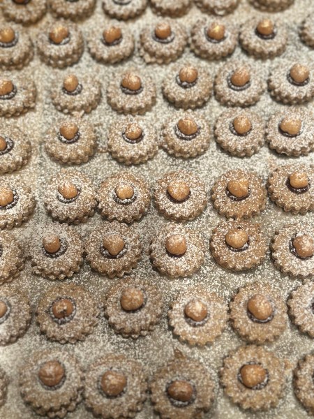 Den Backofen auf 180 Grad (Umluft) vorheizen, 2 Backbleche mit Backpapier auslegen. Den Teig auf der bemehlten Arbeitsfläche ca. 3mm dünn ausrollen und Kreise ausstechen. Diese ca. 10-12 Min. backen und auskühlen lassen.