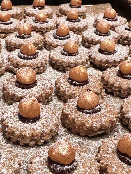 Jeweils zwei Plätzchen mit einem Klecks Karamell zusammensetzen. Die Kuvertüre schmelzen, in ein kleines Papiertütchen füllen, die Spitze abschneiden und jeweils einen großen Klecks Kuvertüre auf die Mitte jedes Spekulatius-Plätzchens setzen. Jeweils eine Haselnuß auf den Schokoklecks setzen. Alles gut trocknen lassen, dann noch leicht mit Puderzucker bestäuben.
