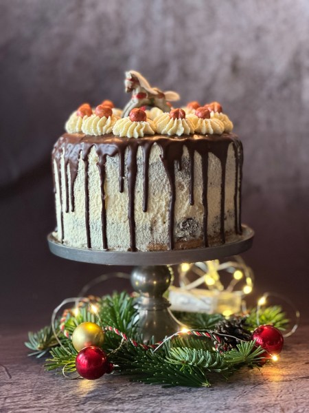 Und dann geht es auch schon ans Zusammensetzen der Torte: die beiden Böden aus der Springform lösen, mit einer ordentlichen Menge (ca. der Hälfte) der Buttercreme aufeinandersetzen und gerne erstmal 30 Min. im Kühlschrank festwerden lassen. Die Torte mit der restlichen Buttercreme ringsrum und oben einstreichen. Dabei noch etwas von der Buttercreme für die Deko zurückhalten. Die Torte wieder in den Kühlschrank stellen und 1-2 Stunden durchziehen lassen.