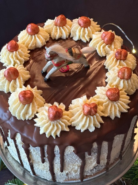 Nun die Glasur auf der Oberfläche der gut gekühlten Torte verteilen und ein wenig über den Rand tropfen lassen. Wenn die Glasur fest ist, die Torte noch mit Buttercremetupfen verzieren und mit kandierten Kirschen oder Haselnüssen (bei mir mit Lebensmittelpulver rot gefärbt) dekorieren.