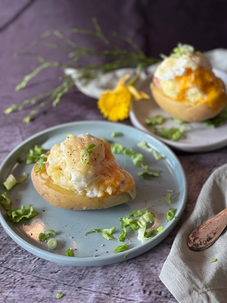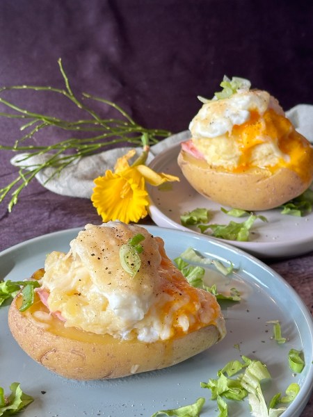 Das pochierte Ei nun auf die Kartoffel geben, etwas geriebenen Cheddar darübergeben und alles noch ca. 10 Min. im Backofen übergrillen.