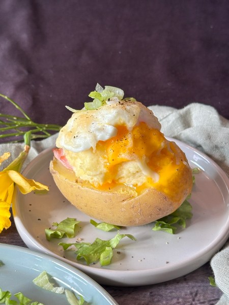 Zubereitung: Die Kartoffel im Ofen backen, bis sie weich ist. Etwas auskühlen lassen und dann mit einem Teelöffel aushöhlen. Es sollen noch ca. 1,5cm Rand übrig bleiben. Die ausgehöhlte Kartoffel mit Salz und Pfeffer würzen und eine Scheibe Schinken hineingeben.