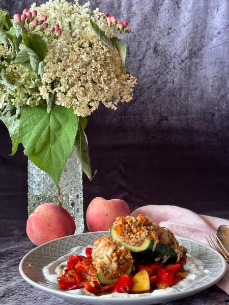 Die gefüllten Zucchini aus dem Ofen nehmen, mit dem Paprika-Nektarinen-Gemüse anrichten und den Kräuter-Joghurt dazu servieren.