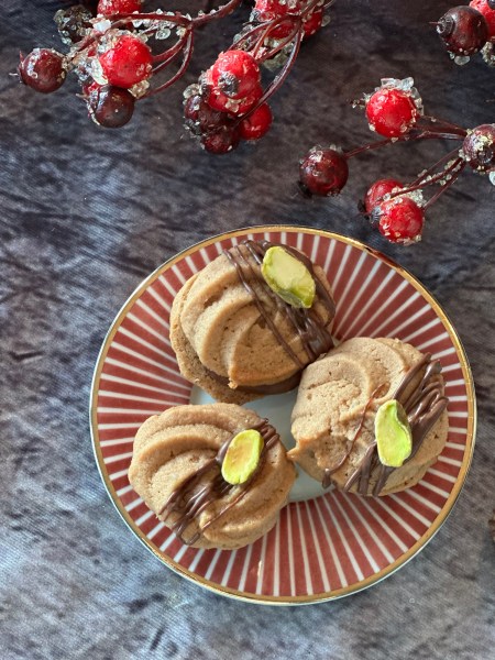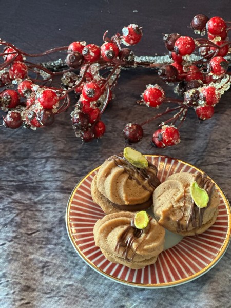 Für die Deko Kuvertüre schmelzen und die Kränzchen damit verzieren. Mit Pistazienhälften bestreuen.
