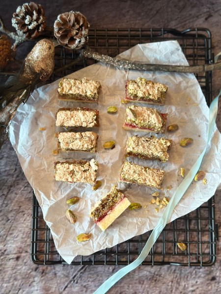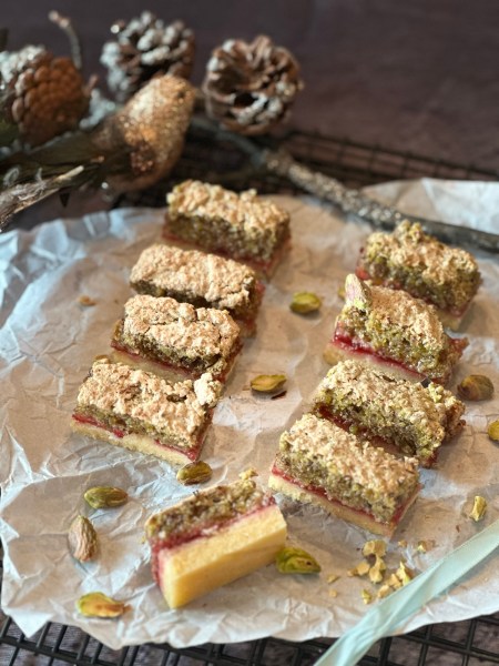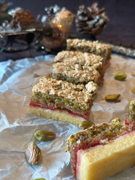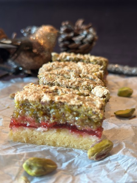 Für den Belag den die Eiweiß mit dem Zucker und dem Salz zu festem Schnee schlagen (ca. 10 Min.), dann die geriebenen Pistazien unterheben. Die Masse in einen breiten Topf (oder Pfanne) füllen und bei mittlerer Hitze abrühren, bis der Topfboden sichtbar ist und sich am Boden ein weißer Belag bildet. Dann auf den bestrichenen Teig geben und bei 180 Grad nochmal ca. 8-10 Min. fertig backen. Die Oberfläche darf leicht gebräunt sein.