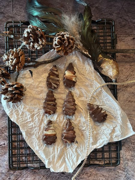 Zubereitung: Den Teig für die Schokoplätzchen nach Anleitung zubereiten, dünn ausrollen und Formen ausstechen (bei mir waren es Zapfen). Bei 180 Grad (Umluft) ca. 8-10 Min. backen und auskühlen lassen.