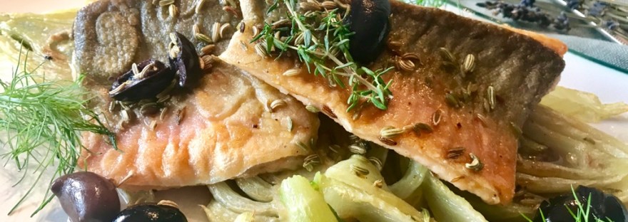 Noch ein Urlaubsrezept! Provenzalisch geschmorter Fenchel - mit einem Schuß Pastis und leckeren Oliven. Fenchelscheiben werden zunächst in einem Sud aus Thymian und Fenchelsamen vorgekocht, danach werden sie noch einmal goldgelb in Olivenöl angebraten. Nachmachen unbedingt empfohlen. Das Gericht eignet sich übrigens perfekt für Gäste, denn man kann den Fenchel wunderbar vorkochen und wenn die… Weiterlesen Starnberger Saibling mit provenzalischem Fenchelgemüse
