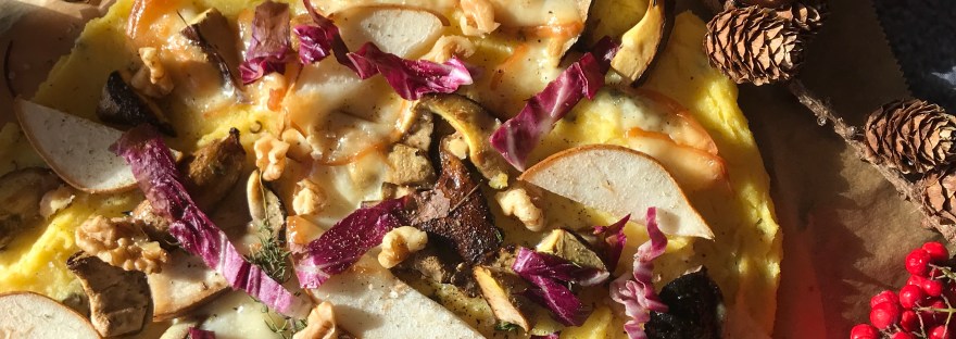 Herbstliche Polenta-Pizza mit Pilzen und Birnen