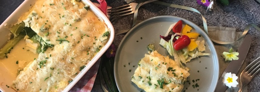 Frühlingslasagne mit Ziegenkäse-Bechamel und Bärlauchpesto