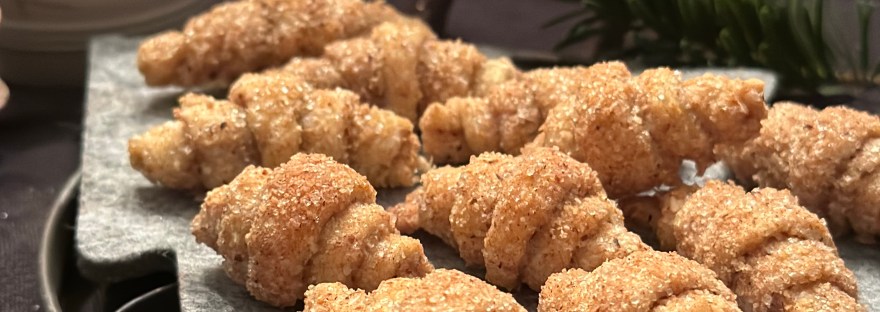 Ein einfaches Rezept mit großer Wirkung. Ich kenne keinen, der sich nicht sofort auf die kleinen Kipferl stürzt. Und sie sind so wandelbar. Je nach Vorrat und Gusto kann man die sie auch mit Schokolade füllen. Oder die Gewürze austauschen. Oder ganz weglassen. Oder andere Nüsse nehmen. Oder Käse und Schinken! Zutaten (für ca. 64… Weiterlesen Haselnuß-Zimt-Kipferl